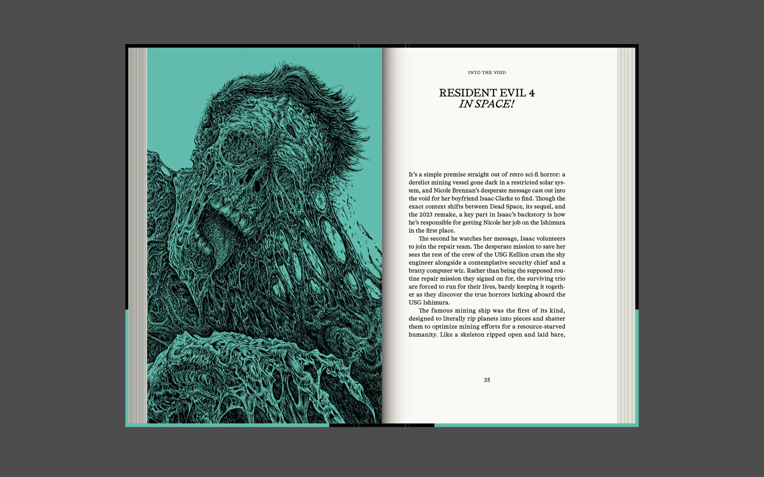 Game journalist Elijah Beahm authored the book, which features new illustrations from Jonathan L Mantia, known for work in the film and comic book industries. The featured interviews include writers such as Brian Evenson, Anthony Johnson, and Jimmy Palmiotti. Other interviews with designers Roman Campos-Orila and Ben Wanat are among a host of creators involved in the Dead Space series.