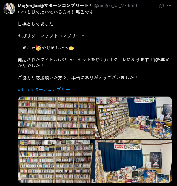 In the post, Mugen_kai said. “It was my goal, Sega Saturn software complete, I did it, I did it, This will include the released titles (excluding value sets) + Saturday Collection! It took about 5 years! Thank you so much to everyone who helped and supported us!”