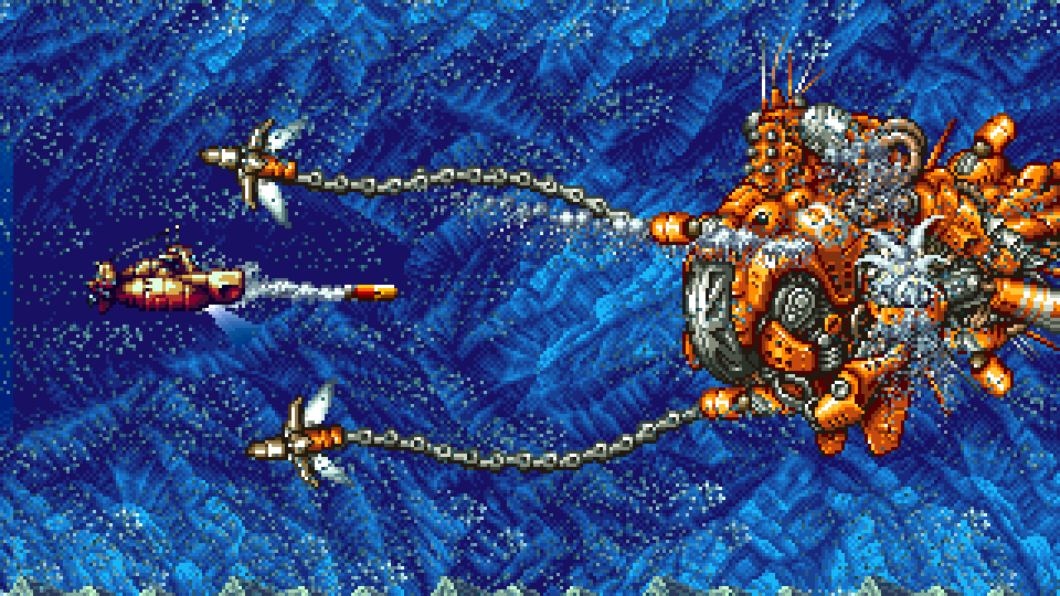 In the Hunt‘s gameplay is reminiscent of a fusion between R-Type and Metal Slug. Players commandeer the “Granvia” submarine on a mission to thwart the nefarious Dark Anarchy Society (DAS), who aim to unleash a devastating super-weapon on an already-ravaged Earth, much of which is submerged due to polar ice cap melting. Equipped to fire torpedoes both forward and upward, the Granvia can also deploy devastating depth charges that detonate on contact with submerged targets. The game introduces an unusual feature for the time: players can control the screen’s scrolling, allowing for a personalized playing tempo by moving the submarine forward or backward — but beware the relentless countdown of the time limit. Power-ups available in the game will be familiar to R-Type fans, offering upgrades like a formidable machine gun, undulating wave shots, and a “cracker” shot that unleashes a volley of bullets. The game also offers a two-player mode for shared adventure.